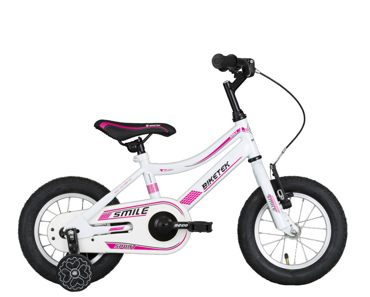 A Koliken Biketek Smile 12 fehér gyerek kerékpár ideális első bicikli kicsiknek, támkerékkel felszerelve a stabilitás érdekében.