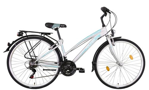 Nők számára kialakított városi közlekedésre alkalmas kerékpár, mindennapi használatra tervezett könnyű kezelhetőségű bringa stabil haladással és kényelmes testtartással.