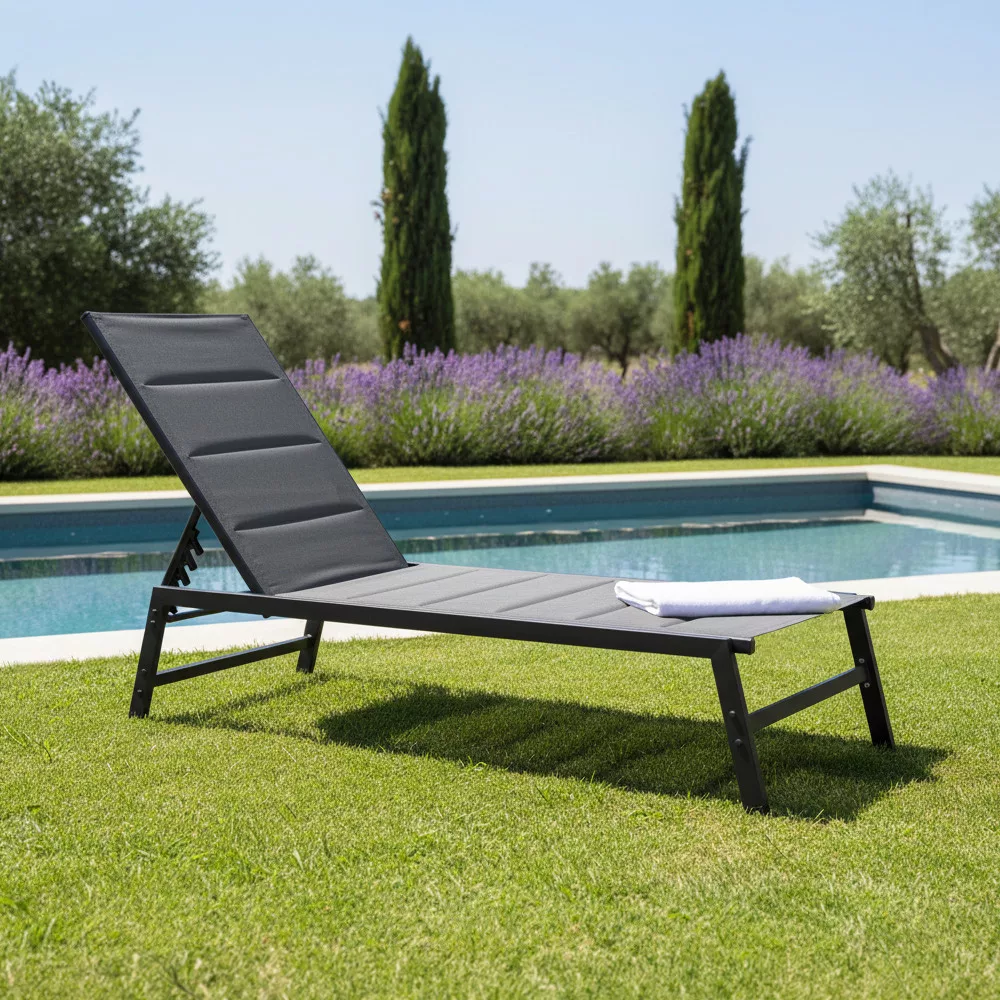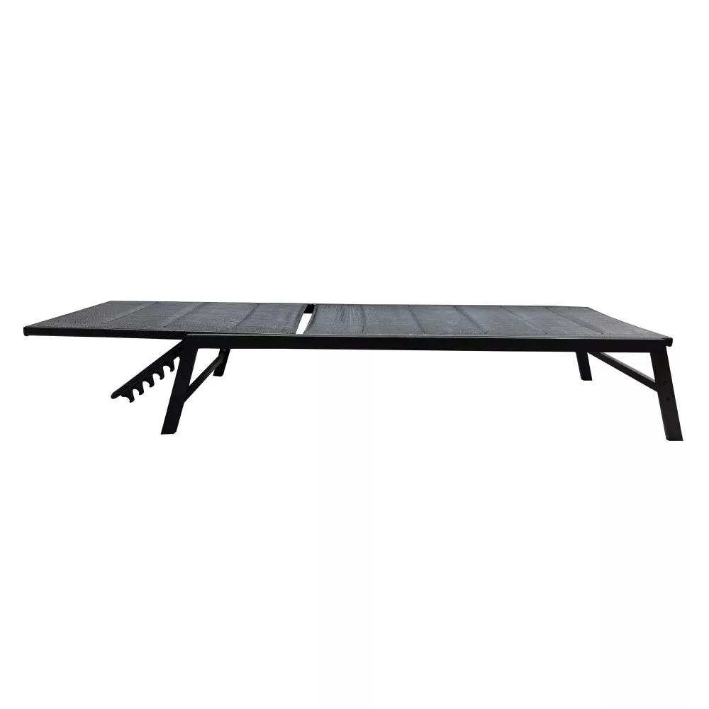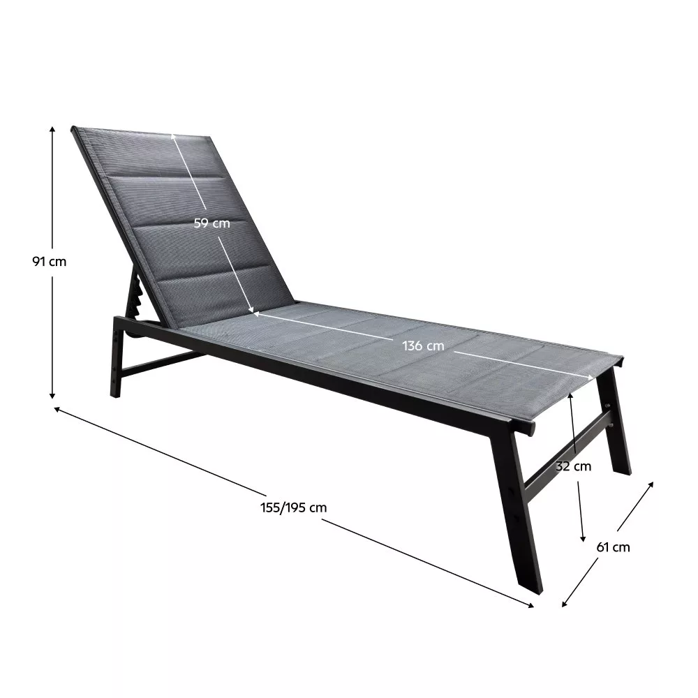 Anyag: fém/szövet Szín: fekete Méretek (SzxMéxMa): 61x155x91 cm Ülésmagasság: 32 cm Ülésmélység: 136 cm Háttámla magassága: 59 cm Teljes mélység lehajtva: 195 cm Teherbírás: 110 kg Kerti Állítható 4 fokozatban dönthető háttámla Szétszerelve szállítva