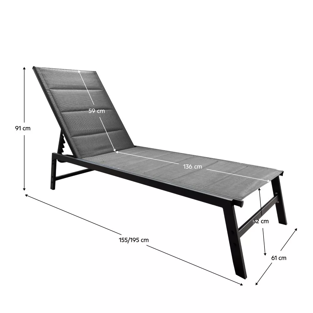 Anyag: fém/szövet Szín: fekete/szürke Méretek (SzxMéxMa): 61x155x91 cm Ülésmagasság: 32 cm Ülésmélység: 136 cm Háttámla magassága: 59 cm Teljes mélység lehajtva: 195 cm Teherbírás: 110 kg Kerti Állítható 4 fokozatban dönthető háttámla Szétszerelve szállítva