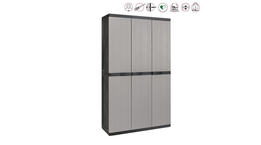 A termék tartós műanyagból készült, ami ellenáll az időjárási hatásoknak és könnyű súlyúvá teszi a szekrényt. A három ajtó biztosítja a zárt tárolást és védi az értékeket, miközben három polc áll rendelkezésre az optimális rendszerezéshez. Mérete ideális kisebb helyiségekbe is, így sokoldalúan alkalmazható.