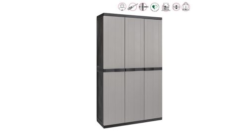 A BIOS MIDI magas szekrény 3A egy praktikus műanyag tároló megoldás, melyet elsősorban garázsokba, pincékbe vagy kültéri helyiségekbe terveztek. Három ajtós kialakítása és három polca lehetővé teszi a tárgyak rendezett elhelyezését, miközben megőrzi azok hozzáférhetőségét. Ideális választás lehet takarítóeszközök vagy egyéb háztartási kellékek rendszerezésére olyan élethelyzetekben, amikor fontos a tartós és könnyen mozgatható bútor használata.