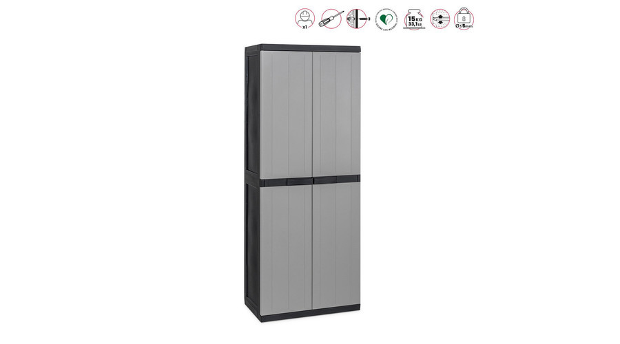 A termék tartós műanyagból készült, ami biztosítja a könnyű kezelhetőséget és a hosszú élettartamot. Könnyen mozgatható kialakítása révén akár különböző helyiségek között is áttelepíthető. A két zárható ajtó védi a benne tárolt dolgokat, míg az egyes polcok terhelhetősége akár 15 kg is lehet, így különféle nehéz eszközök is biztonságosan elhelyezhetők benne.