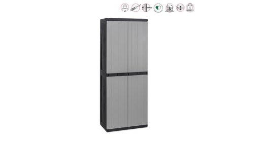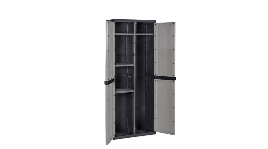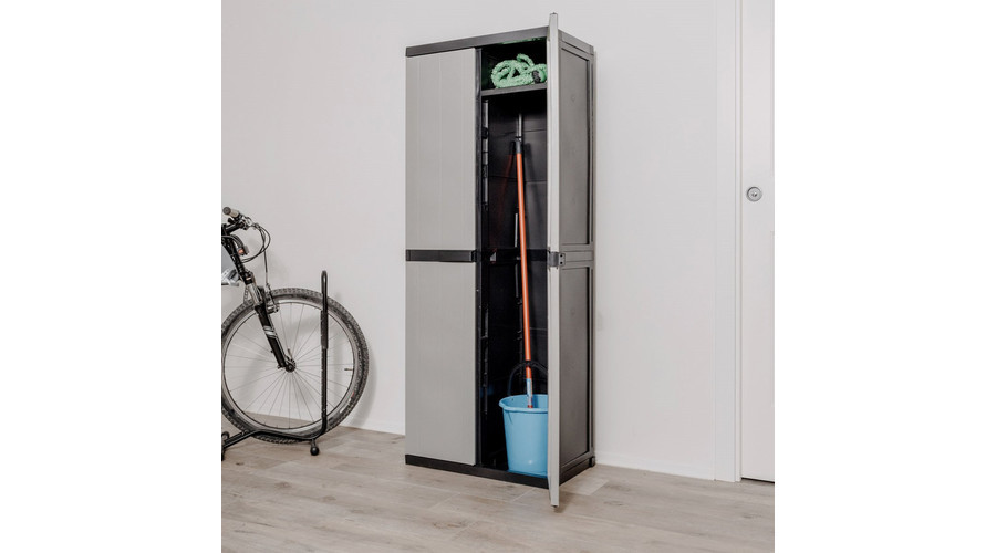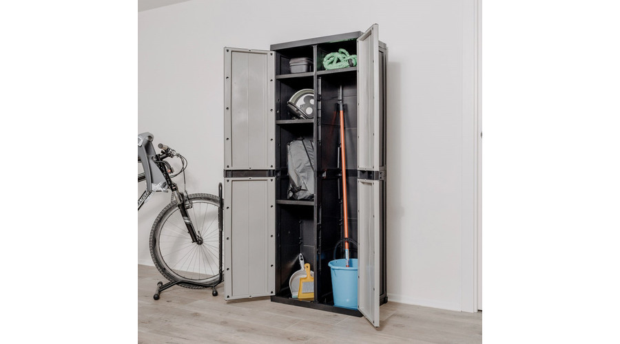 A BIOS MIDI multifunkciós szekrény 2A egy tartós műanyagból készült tárolómegoldás, amely ideális garázsok, pincék és kültéri helyiségek rendszerezésére. A két ajtós kialakítás és a négy polc lehetővé teszi takarítóeszközök, kerti szerszámok vagy háztartási kellékek biztonságos és áttekinthető tárolását. Kiváló választás azoknak, akik praktikus és könnyen mozgatható bútorra vágynak a rendezettség fenntartásához.