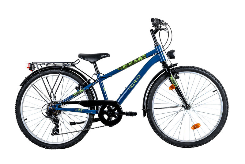 A Neuzer BOBBY 24 CITY kék/fekete gyerek kerékpár strapabíró acél vázzal és 6 sebességes Shimano váltóval készült.