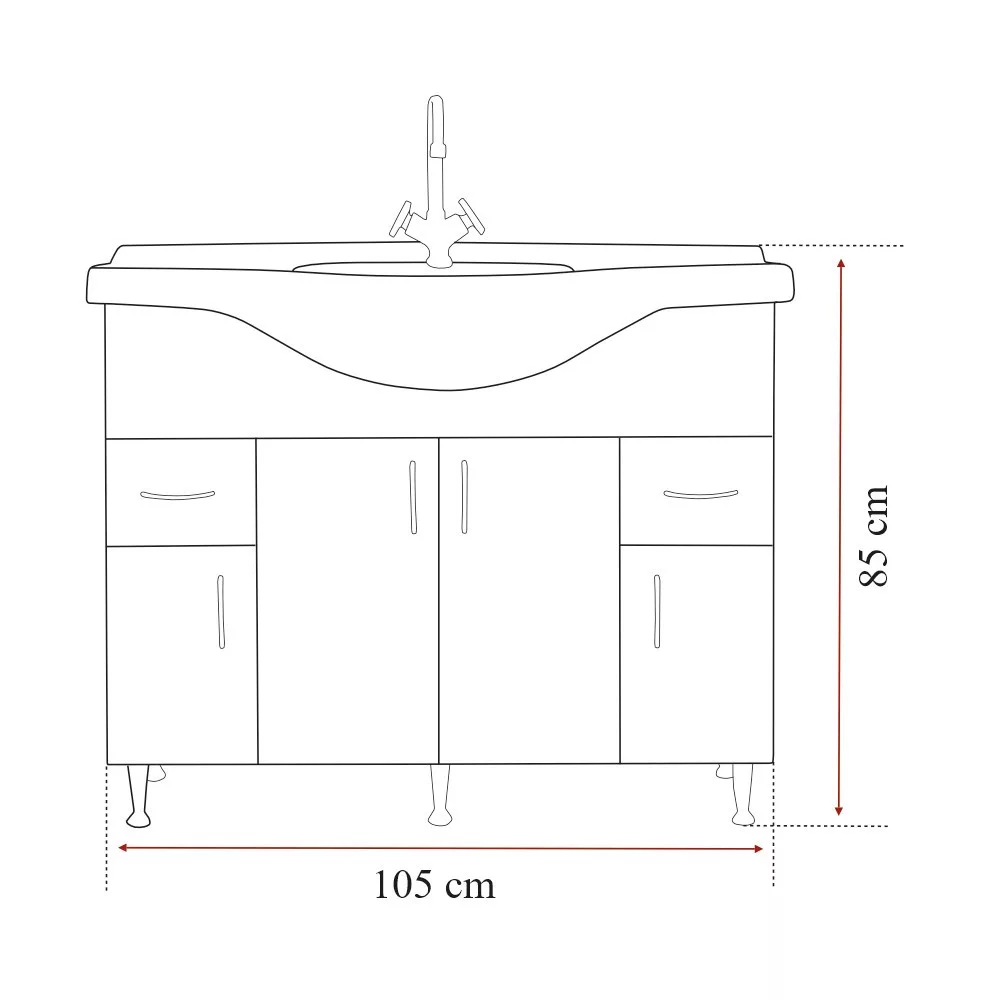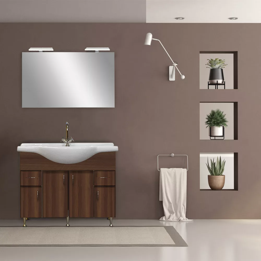 A fürdőszobabútor kevés helyet foglal viszont tágas alsó szekrénnyel és tükörrel (világítás nem része a terméknek) rendelkezik ahol kényelmesen elférnek a fürdőszobai pipere eszközök. Kevés helyigénye miatt kisebb fürdőszobák berendezésére is alkalmas, például panel lakásokban. A termék magas minőségű bútorlapból készül és színben passzoló élzárókkal van ellátva. A fürdőszoba bútor mosdóval együtt kapható.