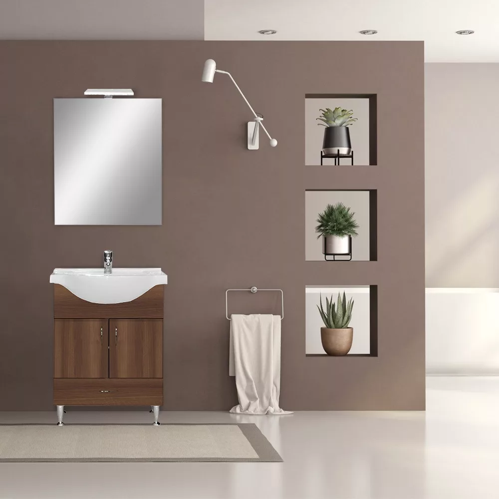 A fürdőszobabútor kevés helyet foglal viszont tágas alsó szekrénnyel és tükörrel (világítás nem része a terméknek) rendelkezik ahol kényelmesen elférnek a fürdőszobai pipere eszközök. Kevés helyigénye miatt kisebb fürdőszobák berendezésére is alkalmas, például panel lakásokban. A termék magas minőségű bútorlapból készül és színben passzoló élzárókkal van ellátva. A fürdőszoba bútor mosdóval együtt kapható.