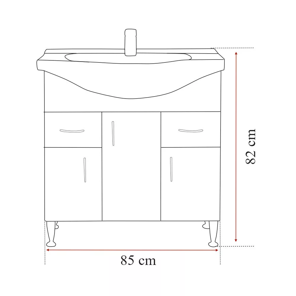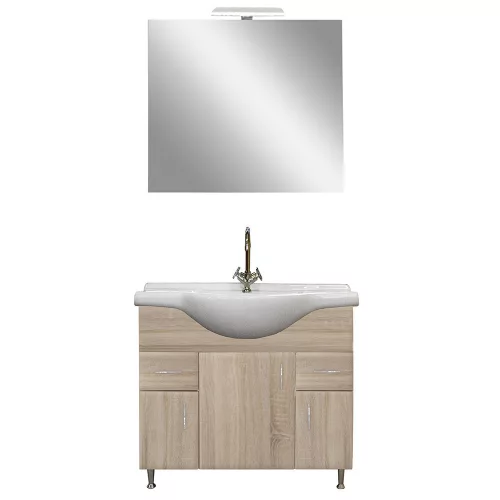 A fürdőszobabútor kevés helyet foglal viszont tágas alsó szekrénnyel és tükörrel (nem része a világítás) rendelkezik ahol kényelmesen elférnek a fürdőszobai pipere eszközök. Kevés helyigénye miatt kisebb fürdőszobák berendezésére is alkalmas, például panel lakásokban. A termék magas minőségű bútorlapból készül és színben passzoló élzárókkal van ellátva. A fürdőszoba bútor mosdóval együtt kapható.