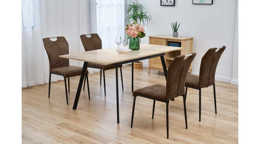 Stabil fekete színű fém váz az asztalnak és a székeknek is egyaránt. A székek textilbőr ülőlapja tökéletes kényelmet biztosít, melyhez a magas háttámla is hozzájárul. Az asztal egy 40 cm-es betéttel 160 cm-re bővíthető, mely erős, strapabíró fém mechanizmussal van megoldva.