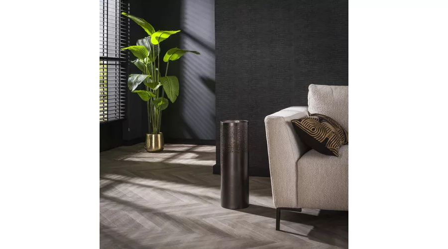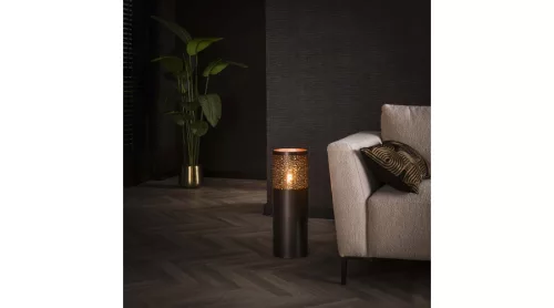 Ez az állólámpa hengeres formájú, 20 cm átmérővel, fémből készült, elegáns fekete nikkel felülettel. A lámpatest felső részén különböző méretű, kerek kivágások találhatók, amelyeken keresztül a fény játékosan szűrődik ki, hangulatos fényhatást teremtve a térben. Letisztult, mégis karakteres megjelenésének köszönhetően modern és indusztriális enteriőrökben is remekül mutat. A tökéletes fényélmény érdekében LED izzó használata ajánlott.