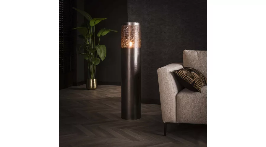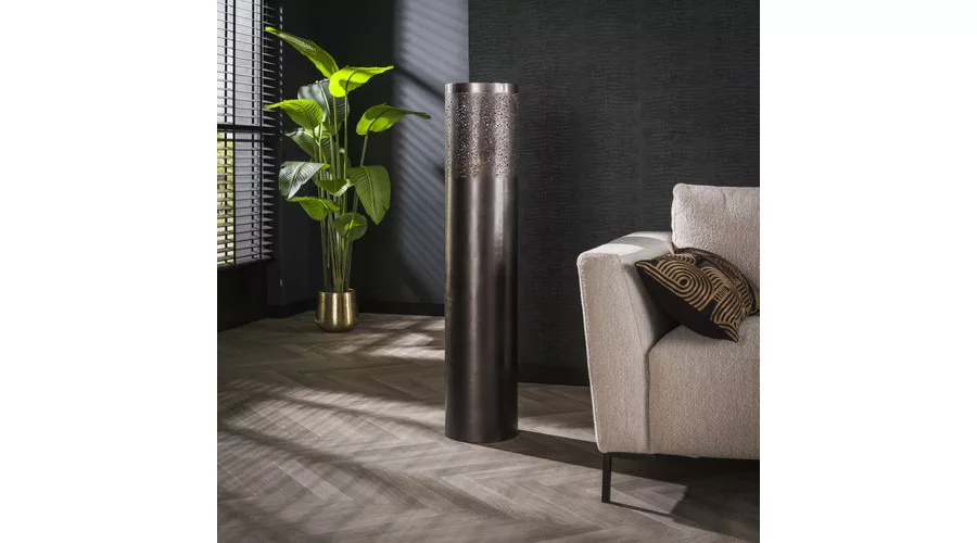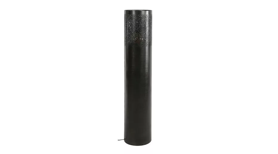 Ez az állólámpa hengeres formájú, 25 cm átmérővel, fémből készült, elegáns fekete nikkel felülettel. A lámpatest felső részén különböző méretű, kerek kivágások találhatók, amelyeken keresztül a fény játékosan szűrődik ki, különleges, hangulatos fényhatást teremtve a térben. Letisztult, mégis karakteres megjelenésének köszönhetően modern és indusztriális enteriőrökben is remekül mutat. A tökéletes fényélmény érdekében LED izzó használata ajánlott.