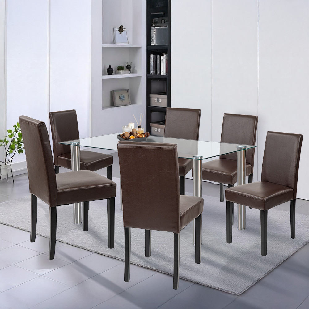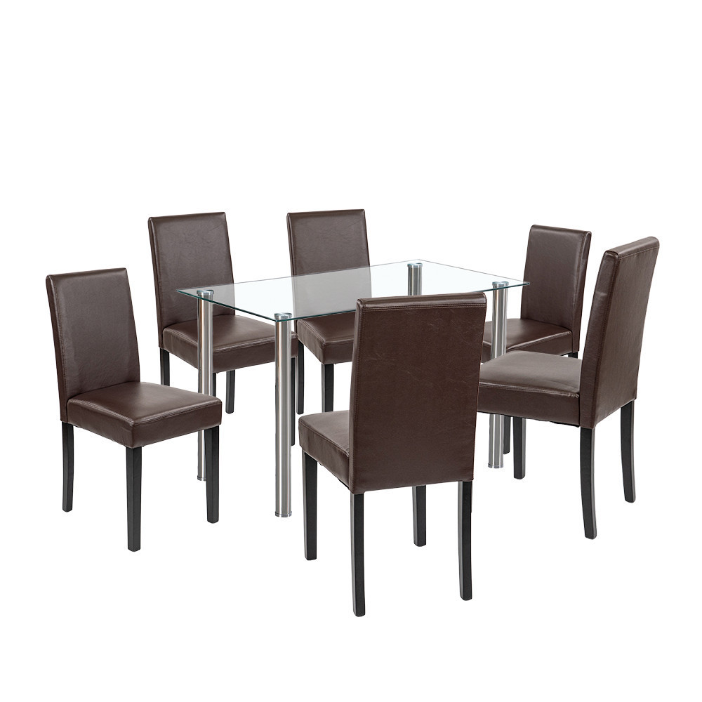 A szett hat darab Leziter Kelly széket is tartalmaz, amelyek barna ECO bőr kárpitozással készültek. Az elegáns megjelenés mellett ezek a székek rendkívül könnyen tisztíthatók. A 4 cm vastag habszivacs ülőfelület hosszabb étkezések során is komfortot nyújt, a stabil fenyőfa lábak pedig 120 kg teherbírással garantálják a hosszú távú megbízhatóságot.