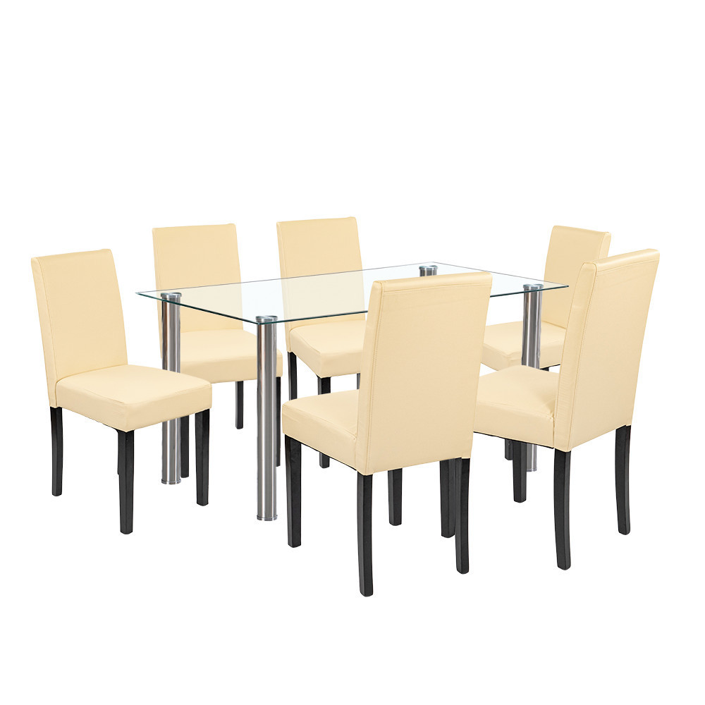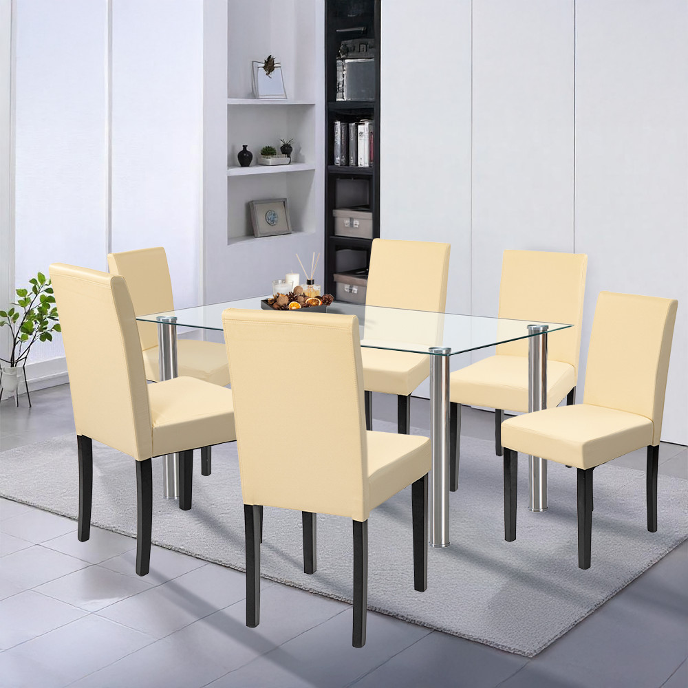 A szett hat darab Leziter Kelly széket is tartalmaz, amelyek bézs ECO bőr kárpitozással készültek. Az elegáns megjelenés mellett ezek a székek rendkívül könnyen tisztíthatók. A 4 cm vastag habszivacs ülőfelület hosszabb étkezések során is komfortot nyújt, a stabil fenyőfa lábak pedig 120 kg teherbírással garantálják a hosszú távú megbízhatóságot.
