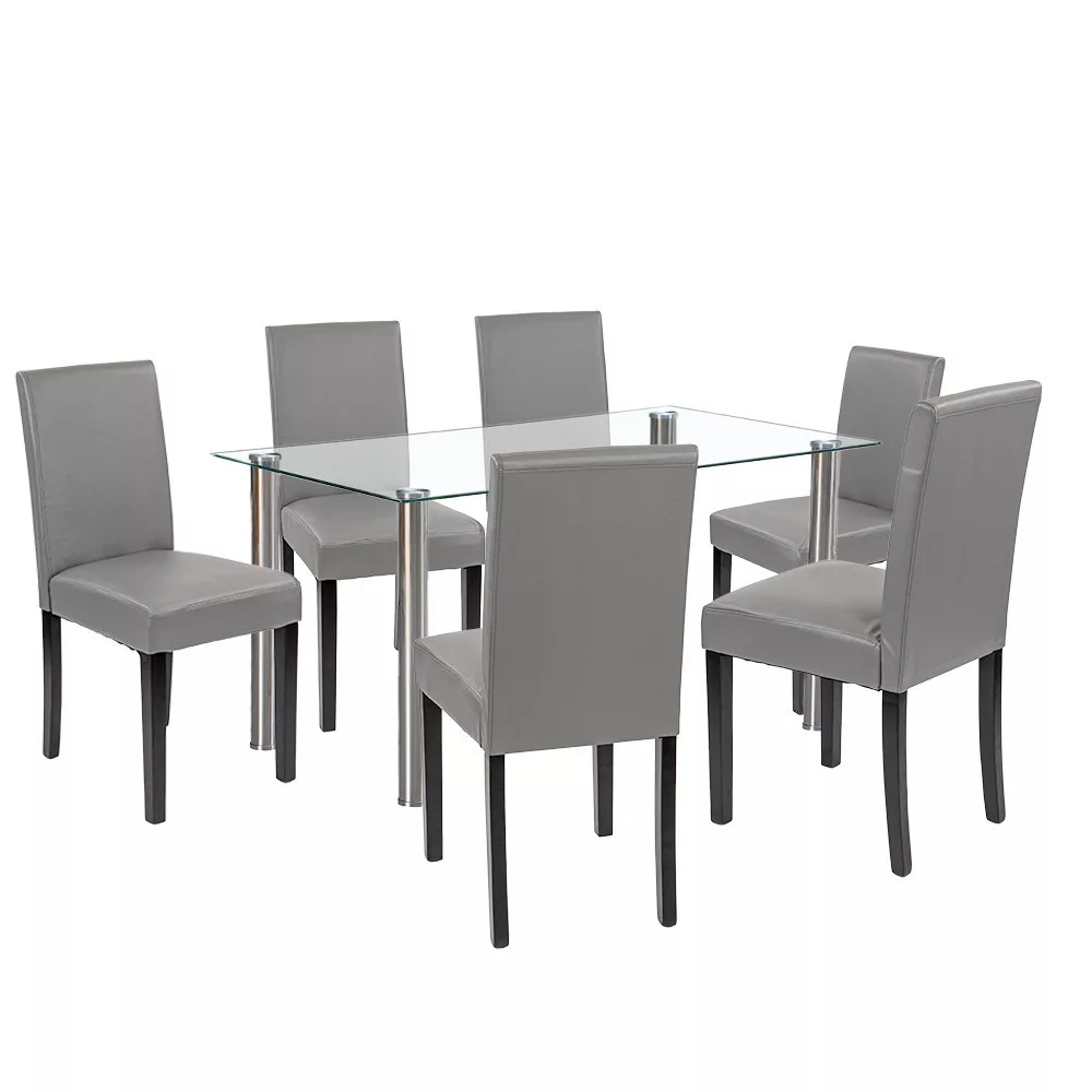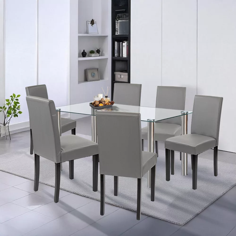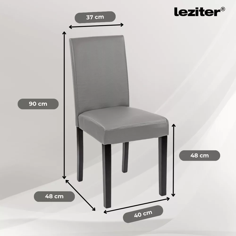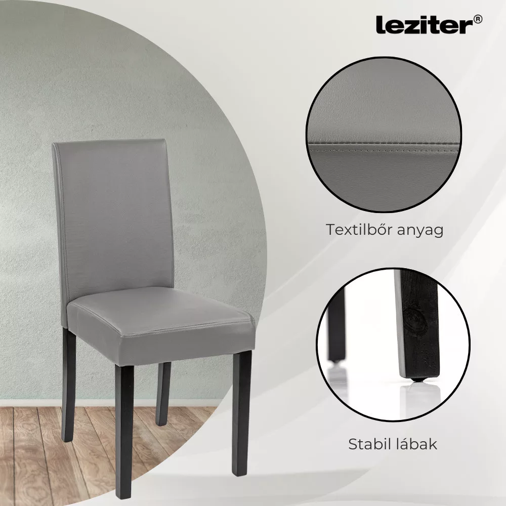 A szett hat darab Leziter Kelly széket is tartalmaz, amelyek szürke ECO bőr kárpitozással készültek. Az elegáns megjelenés mellett ezek a székek rendkívül könnyen tisztíthatók. A 4 cm vastag habszivacs ülőfelület hosszabb étkezések során is komfortot nyújt, a stabil fenyőfa lábak pedig 120 kg teherbírással garantálják a hosszú távú megbízhatóságot.
