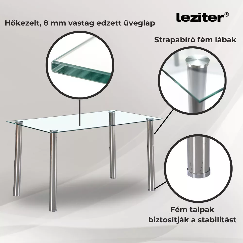 A Leziter Cadiz 6 személyes étkezőgarnitúra minden apró részlete a kényelmet és a praktikusságot szolgálja. A garnitúra része a Leziter Berna étkezőasztal, amely 8 mm vastag edzett üveglappal és rozsdamentes acél lábakkal készült. Az asztallap hőkezelt, karc- és ütésálló, így hosszú távon is megőrzi prémium megjelenését. A 140x80x75 cm-es méret elegendő helyet kínál 4-6 fő számára is, miközben letisztult, minimalista megjelenésével eleganciát sugároz bármilyen környezetben. A lábak alján található műanyag gyűrűk pedig védik a padlót a karcolásoktól és kopástól.