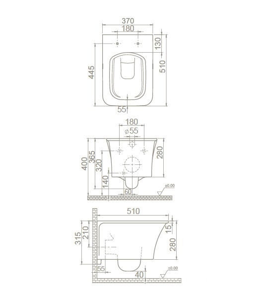 CeraStyle IBIZA fali WC - szögletes - rimless - perem nélküli - 51 cm