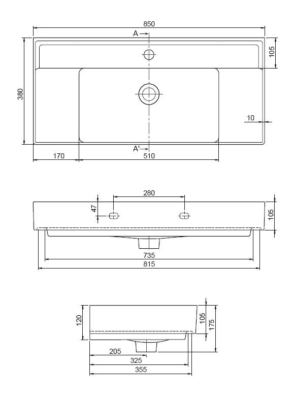 CeraStyle SHARP - KESKENY - porcelán mosdókagyló 85 cm - 85 x 38 cm