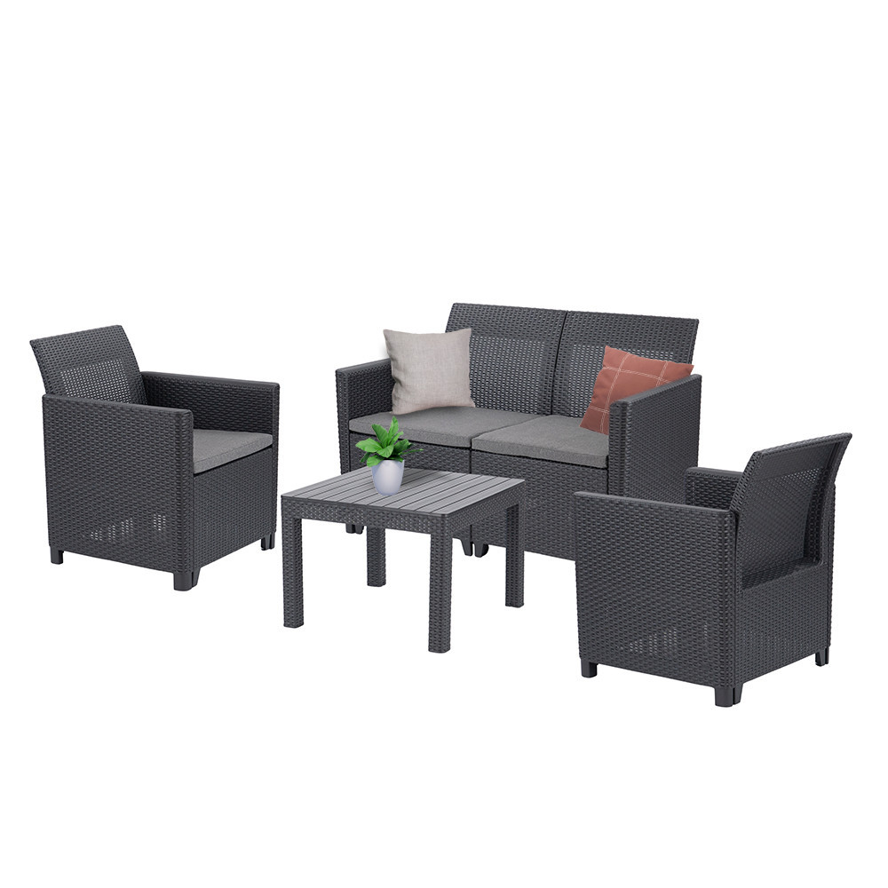 A fotelek és a kanapé kialakítása megfelelő háttámaszt biztosít, a szürke ülőpárnák pedig gondoskodnak a kényelmes pihenésről a szabadban.