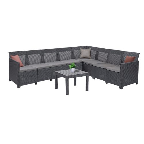 A modern, sötétszürke rattan hatású felület esztétikus és rendkívül időjárásálló – nem fakul, nem reped, és még UV-védelemmel is rendelkezik. A puha ülőpárnák a csomag részei, így rögtön használatba is veheted.