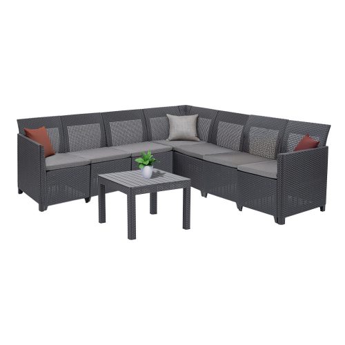 A Keter Claire XII 7 személyes sarokgarnitúra Orlando asztallal variálható, bővíthető bútorcsalád szerszám nélkül összeszerelhető, és teljes szabadságot ad, hogy saját ízlésed és helyigényed szerint alakítsd ki a kültéri nappalidat.