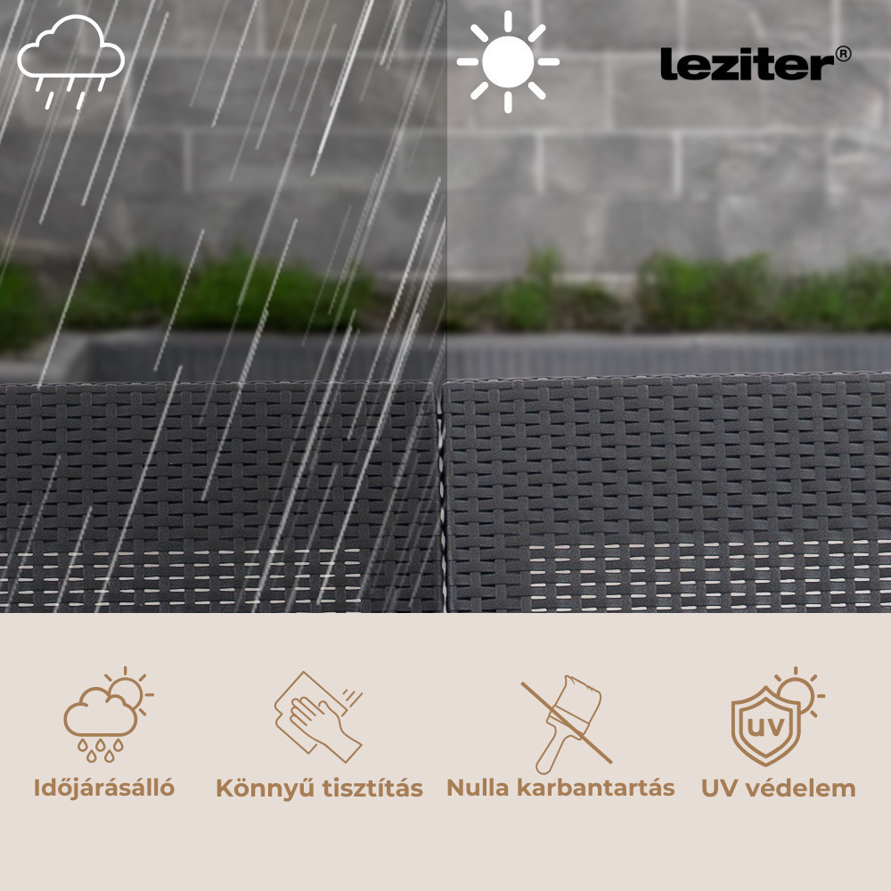 A rattan hatású műanyag nagy sűrűségű polipropilénből készült, amely ellenáll a hőmérséklet-ingadozásnak, UV-sugárzásnak és páratartalomnak. A "click-in" rendszerű összeszerelés pedig stabilan illeszti össze az elemeket, miközben szerszámra sincs szükség.