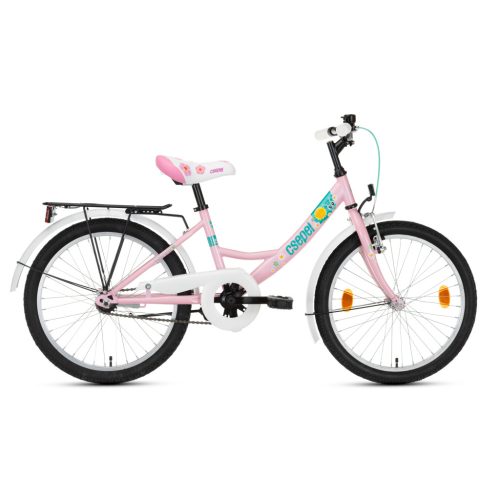 Csepel gyermek kerékpár 20 colos méretben kezdő gyerekeknek, akik biztonságos és kényelmes biciklizést keresnek rózsaszín virágmintával díszítve.