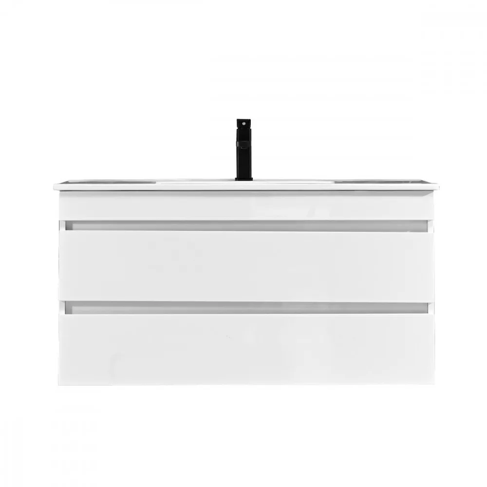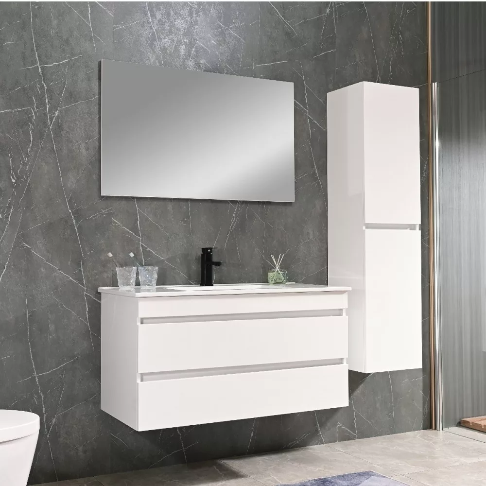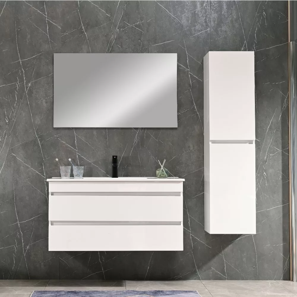 A fürdőszoba bútor rendelkezik két tágas fiókkal ahol kényelmesen elférnek a fürdőszobai pipere eszközök. Kompakt kivitele miatt kisebb fürdőszobák berendezésére is alkalmas, például panel lakásokban. A termék magasfényű festett fronttal és korpusszal emellett színben passzoló élzárókkal van ellátva. A fürdőszoba bútor felfüggesztett kivitelben kapható.