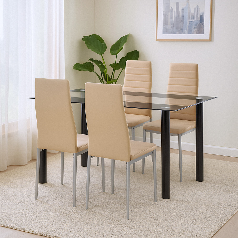 A bézs-szürke színkombináció remekül harmonizál a füstszürke üvegasztal színvilágával, így a teljes szett vizuálisan is egységes és kiegyensúlyozott.