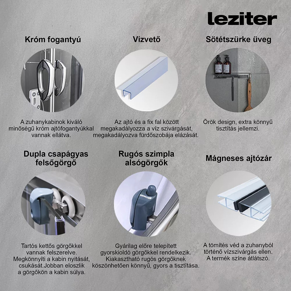 A kabint 5 mm vastag edzett biztonsági üveg veszi körül, amely sötétszürke fix üveg- és ajtópanelekkel, illetve fekete üvegfalakkal fokozza az esztétikai megjelenést. A matt króm vezetősínek és profilok tovább emelik a termék eleganciáját, míg a matt króm funkciópanel a vezérlési lehetőségek középpontjában áll. A kabin 6 hidromasszázs fúvókával rendelkezik, amely garantálja az egész testet átölelő masszázsélményt, miközben a beépített rádió, ventilátor, LED háttérvilágítás és felső világítás tovább fokozza a relaxáció élményét.
