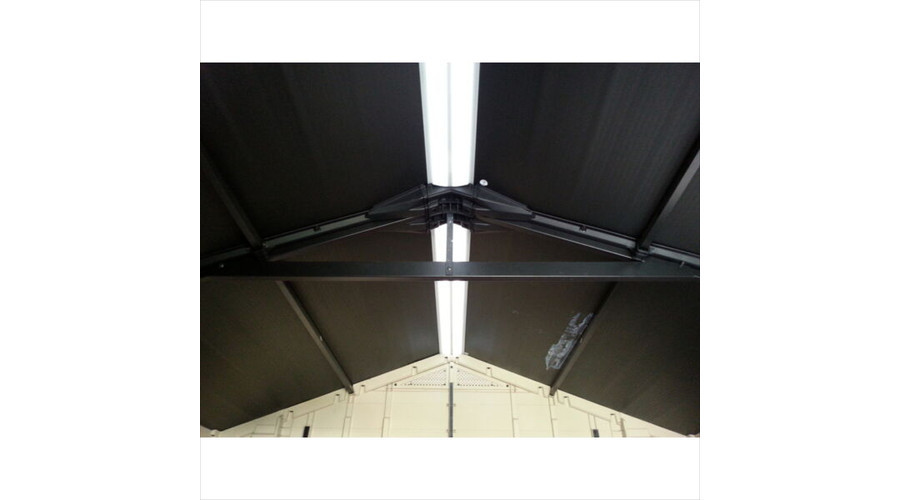 V: A termék mérete 257x332x243 cm, ami elegendő teret biztosít különféle kerti eszközök számára.