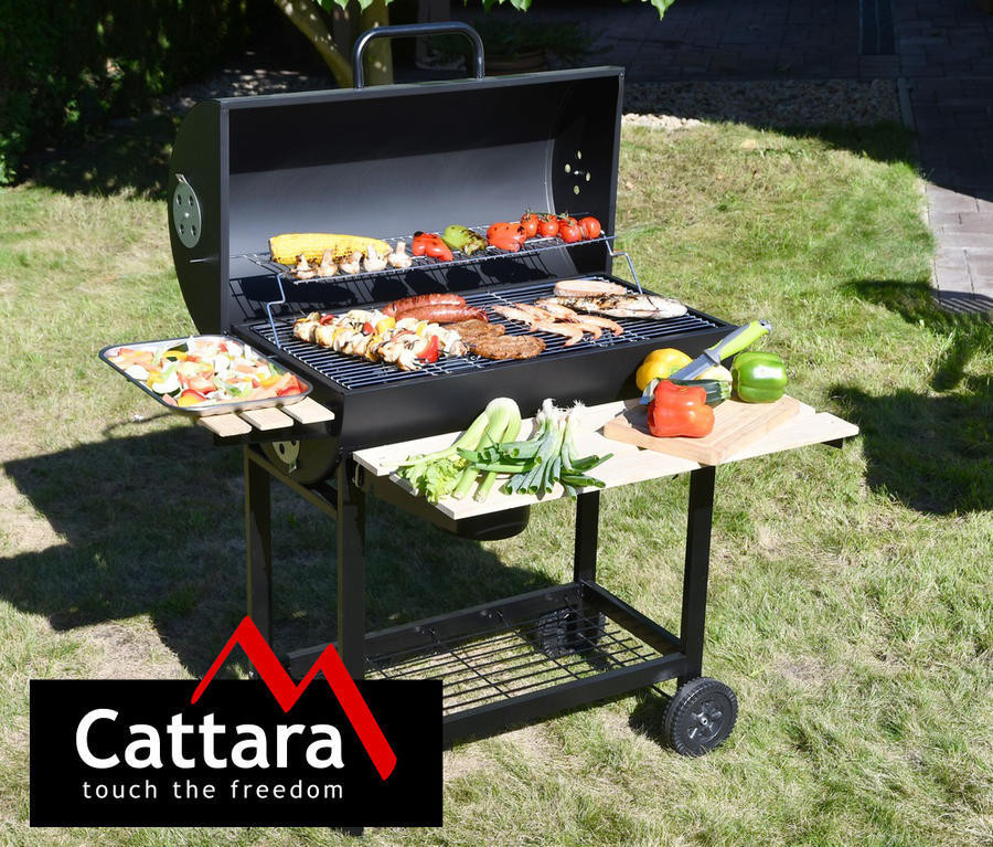 Nagyméretű faszén kerti grill nagy grillezővel és sokféle tárolóhellyel.