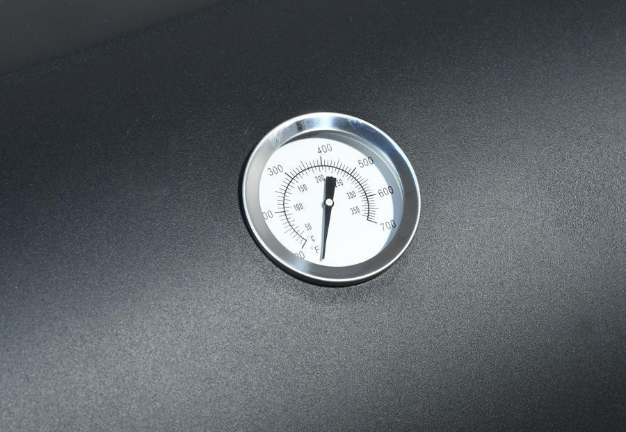 A fedél beépített hőmérővel van felszerelve a hőmérséklet szabályozására, a nagy grillezőfelület króm ráccsal és a grill előtt található praktikus tárolópolc biztosítja a kényelmes elkészítést. finomságokat.