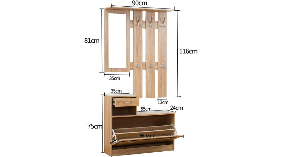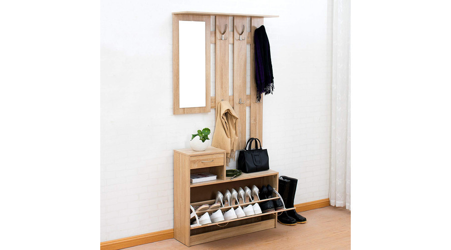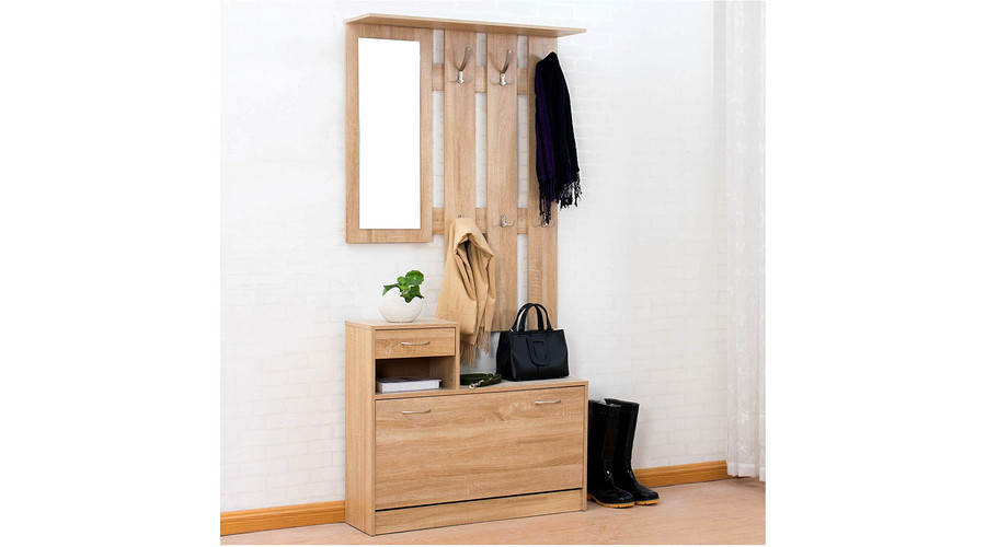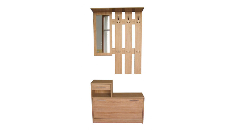 Tükrös előszobabútor klasszikus fehér tölgy színben. Praktikus és jól pakolható, mert rendelkezik akasztós résszel, polcos szekrénnyel és egy kihúzható fiókkal is. Ajánljuk irodába és otthonra egyaránt.