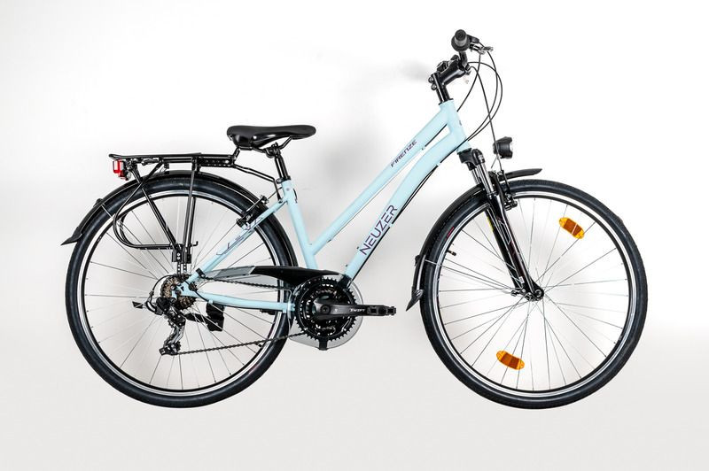 A Neuzer Firenze 50 nõi babyblue/lila 19 alumínium váza biztosítja a stabil haladást és könnyű irányíthatóságot városi közlekedés során. A Shimano Tourney háromszoros első és hétszeres hátsó váltóval felszerelt hajtómű lehetővé teszi a gördülékeny sebességváltást bármilyen terepen. A SunTour villa hatékonyan csillapítja az úthibák okozta rezgéseket, így kényelmes testtartást tesz lehetővé hosszabb utakon is. A Mach1 duplafalú felnikkel szerelt kerékméret megfelel a trekking kerékpárokhoz elvárt tartósságnak és stabilitásnak. Az elemes világítás és sárvédők tovább növelik a biztonságot és praktikusságot mindennapi használat közben.