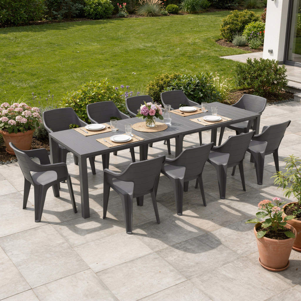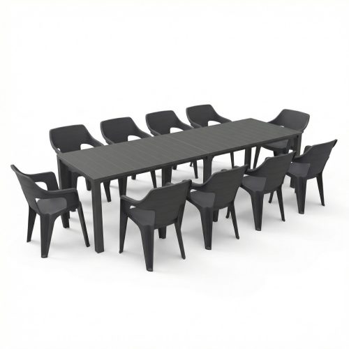A Florin 10+1 kerti bútor garnitúra szett grafit színben ideális választás, ha sok ülőhelyre, rugalmasan használható asztalra és praktikus kültéri bútorokra van szükséged.