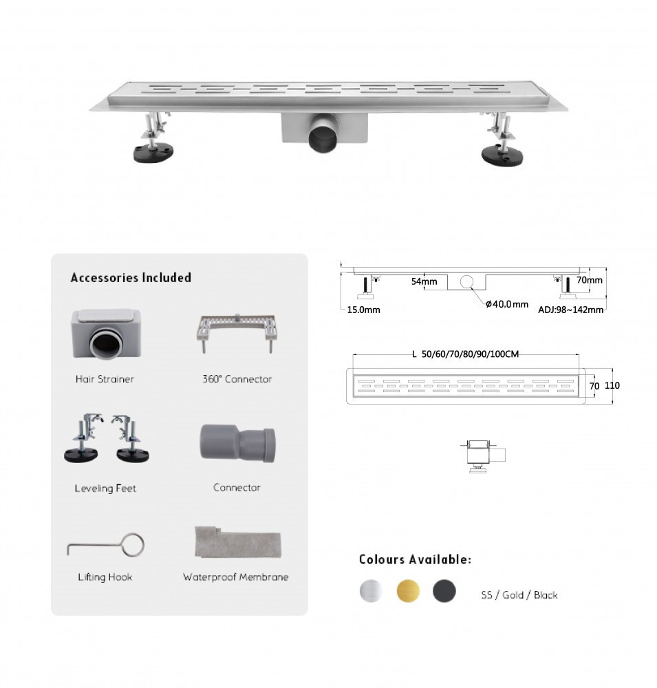 Acél alapteset szigetelő peremmel van ellátva. A termék csiszolt fényes ráccsal van ellátva. Alacsony beépítésű, közvetlenül zuhanyajtó alá vagy fal mellé építhető. Sav és lúgálló ami szintén hatalmas előny takarítás szempontjából. , ugyanis ennek a tulajdonságának köszönhetően nem roncsolódik erős tisztítószerek használatakor. A szifon a csomag részét képzi.