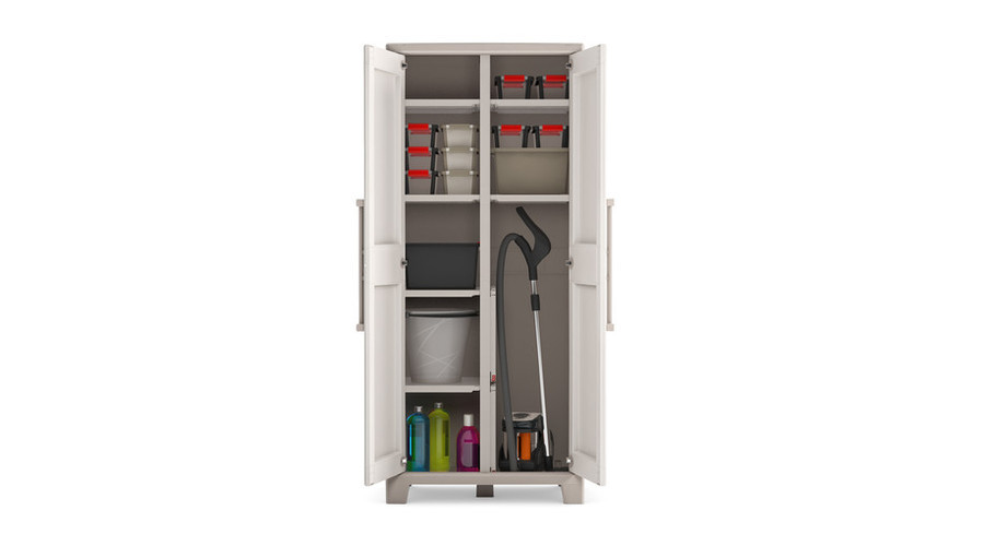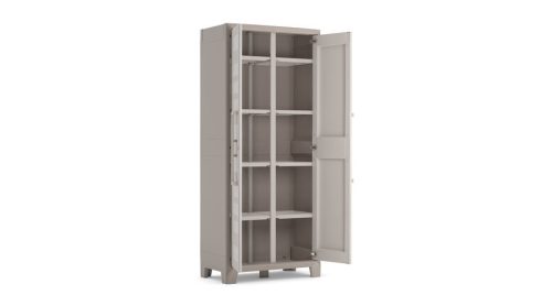 A Gulliver műanyag tároló szekrény multifunkciós kialakítása lehetővé teszi mind kültéri, mind beltéri használatát, így sokféle felhasználási területre alkalmas. Teljes mértékben vízálló, ezért ideális például kerti eszközök vagy háztartási tárgyak biztonságos elhelyezésére a változó időjárási körülmények között is. A megerősített fém ajtópántok biztosítják a stabil záródást, miközben a polcok egyenként akár 30 kg terhelést is elbírnak, így nagyobb súlyú tárgyakat is könnyedén rendszerezhetünk benne.