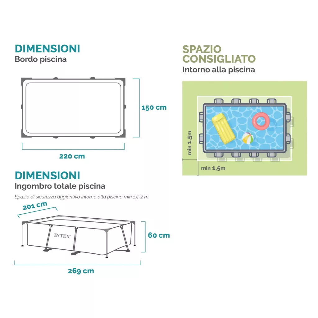 Szinterezett fémvázas medencetest, vízforgató nélkül. Az erős PVC medence testet csőváz tartja, amelyek a testen kialakított füleken keresztül tolva merevítik a szerkezetet. A medencetest tartalmazza a bekötőcsonkot. Javasolt vízforgató: Intex i28602 vagy i28604.