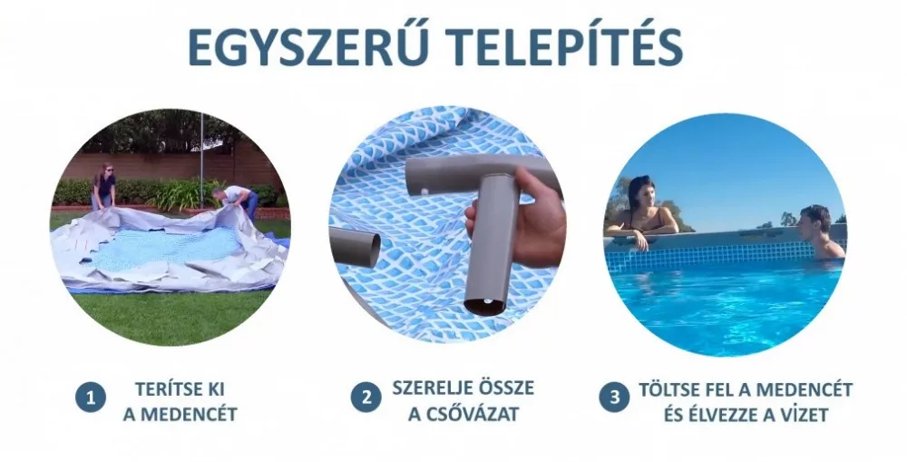 Szinterezett fémvázas medencetest, vastag és extra tartós 3 rétegű szálerősített fóliával, 3,78 m³/h teljesítményű papírszűrős vízforgatóval. Az erős PVC medence testet csőváz tartja, amelyek a testen kialakított füleken keresztül tolva merevítik a szerkezetet.