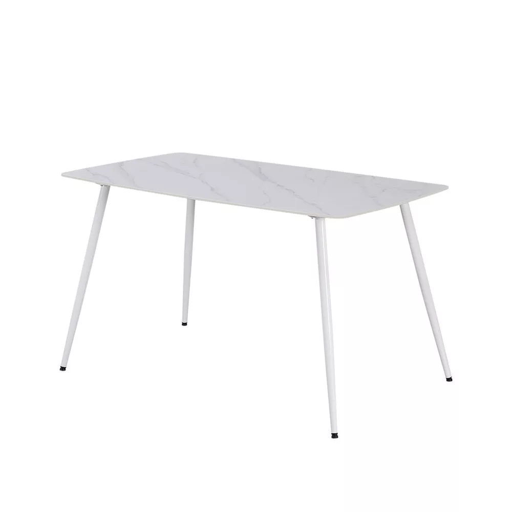 Az asztal fehérre festett, masszív fém lábai stabil tartást adnak, a műanyag végződések pedig védik a padlót a karcolásoktól – akár fa-, akár csempeburkolatról van szó. Kompakt, de kényelmes méretével (140×80 cm) akár 4–6 fő kényelmesen elfér körülötte.