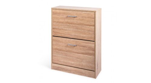 A két lenyitható fióknak köszönhetően a cipők könnyen rendszerezhetők és védettek maradnak a portól. Az MDF-lapból készült szerkezet stabilitást biztosít miközben modern fehér tölgy színével harmonizál bármilyen belső térrel. Kompakt kialakítása révén kis helyeken is elfér anélkül, hogy zsúfolttá tenné az előteret.