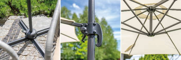 A kerti napernyő stabilitását jelentősen befolyásolja a kereszt talp. Az Ön kényelme érdekében egy rögzített fogantyú segítségével könnyen összecsukható. A napernyő előnye az alapban lévő forgó mechanizmus és a dőlésszög beállítás kombinációja. Ez lehetővé teszi az ernyő tetszőleges pozícionálását és az árnyékoló hely kiválasztását a napfény beesési szögének megfelelően.