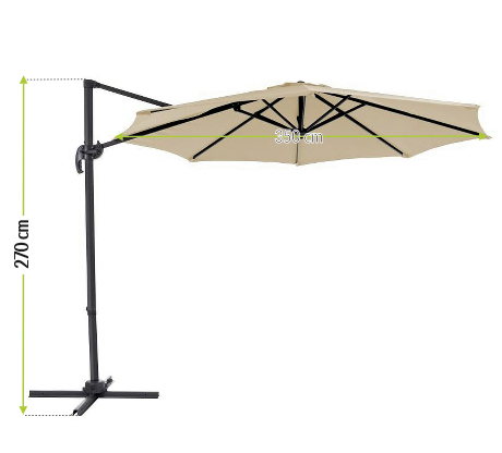 A napernyő szerkezete könnyű és deformációval szemben ellenálló alumíniumból biztosítja a tartósságot és garantálja, hogy a termék hosszú évekig szolgál majd korrózió jele nélkül. Az alapban lévő forgórendszer 360 fokos forgatást tesz lehetővé. A hatlépcsős beállításnak köszönhetően megváltoztathatja magának a ponyvának a szögét, amelyet egy 8 bordás szerkezet erősít meg.