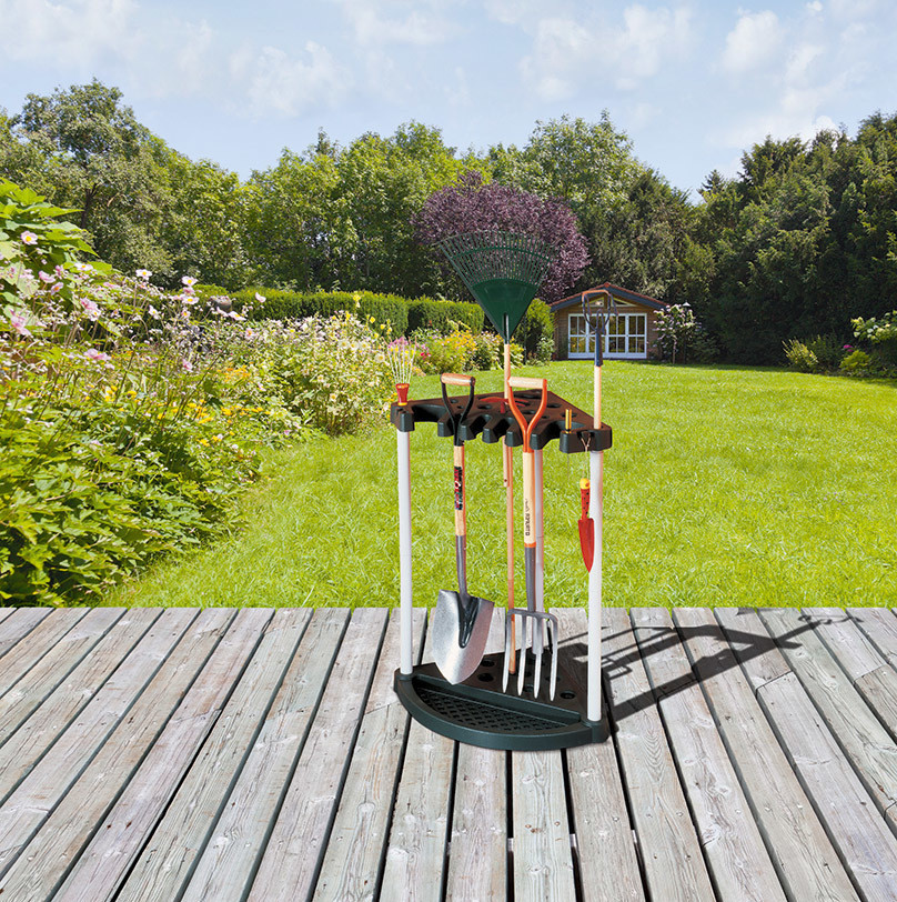 A KETER műanyag kerti eszköz/szerszámtartója kivételesen strapabíró és funkcionális, mely a sarokba állítva kis helyet foglal, mégis több szerszám tárolására szolgál.