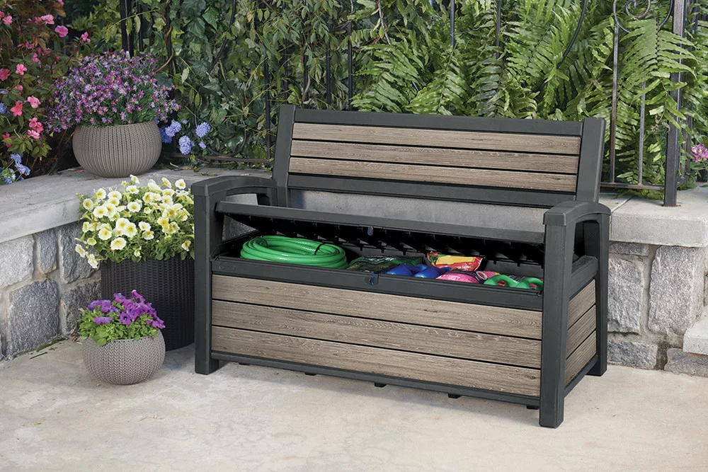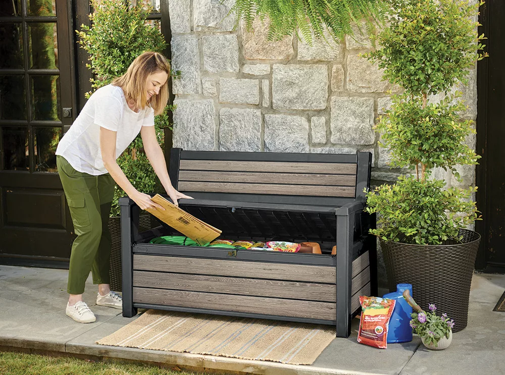 Világos, fa hatású kerti pad beépített tárolóval. A Keter DECO GARDEN praktikus és esztétikus megoldás teraszra, erkélyre vagy kertbe.