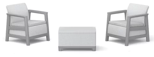 A szett kifejezetten kisebb erkélyekre és teraszokra lett tervezve, ahol fontos a helytakarékos elrendezés és a funkcionalitás. A két kényelmes karosszék mellett a csomag egy praktikus, tárolóhellyel ellátott asztalt is tartalmaz, amely ideális kisebb kerti kiegészítők, párnák vagy személyes tárgyak elhelyezésére.