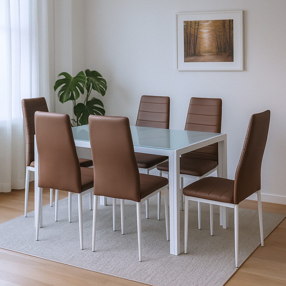 Liana 6+1 étkezőgarnitúra – Modern stílus barna székekkel és edzett üvegasztallal