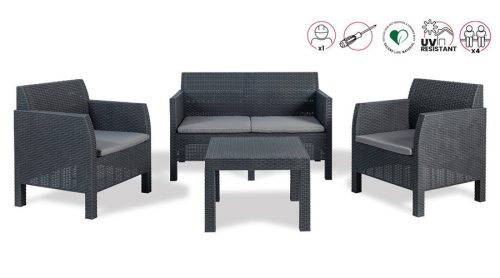 A MATILDE 4 személyes kerti szett szürke ideális kültéri használatra teraszokon vagy kertekben, ahol fontos a kényelmes ülőhely biztosítása kisebb társaságok számára. Kiválóan alkalmas nyári grillezésekhez, délutáni teázásokhoz vagy családi beszélgetésekhez olyan helyzetekben, amikor stílusos és praktikus bútort keresünk. Az UV-álló műanyag kialakítás révén hosszabb távon is ellenáll az időjárási viszontagságoknak.