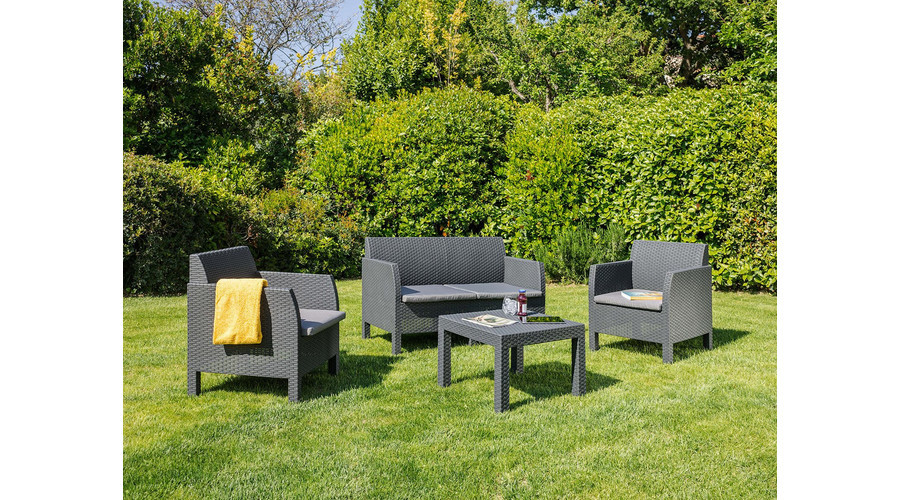 A MATILDE 4 személyes kerti szett szürke egy modern és praktikus kültéri bútor megoldás, amely elsősorban családi kertekben és teraszokon használható. Ez a főként műanyagból készült kerti szett ideális választás szabadtéri pihenéshez, baráti összejövetelekhez vagy akár nyári vacsorákhoz. A kanapé, két fotel és az asztal együttese kényelmes helyet biztosít négy fő számára, akik szeretnének élvezni egy kellemes délutánt vagy estét a friss levegőn. A párnázott ülések tovább fokozzák a komfortérzetet, miközben az UV-álló anyag garantálja a hosszú élettartamot és az időjárásállóságot.
