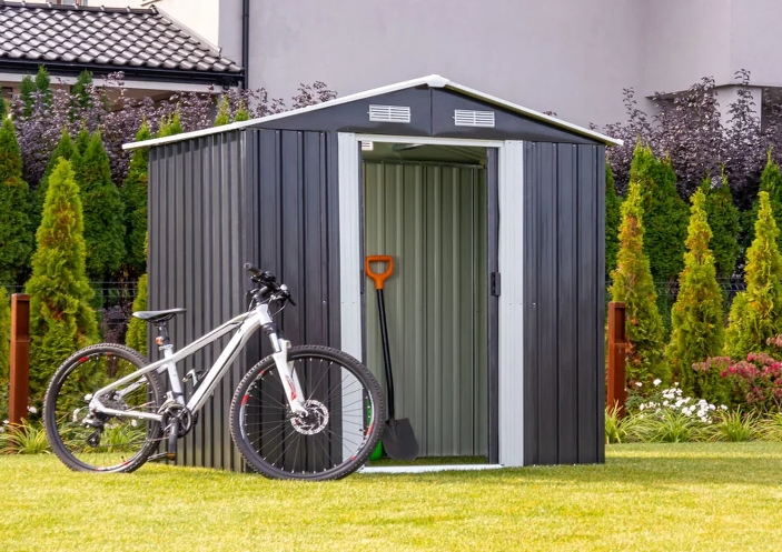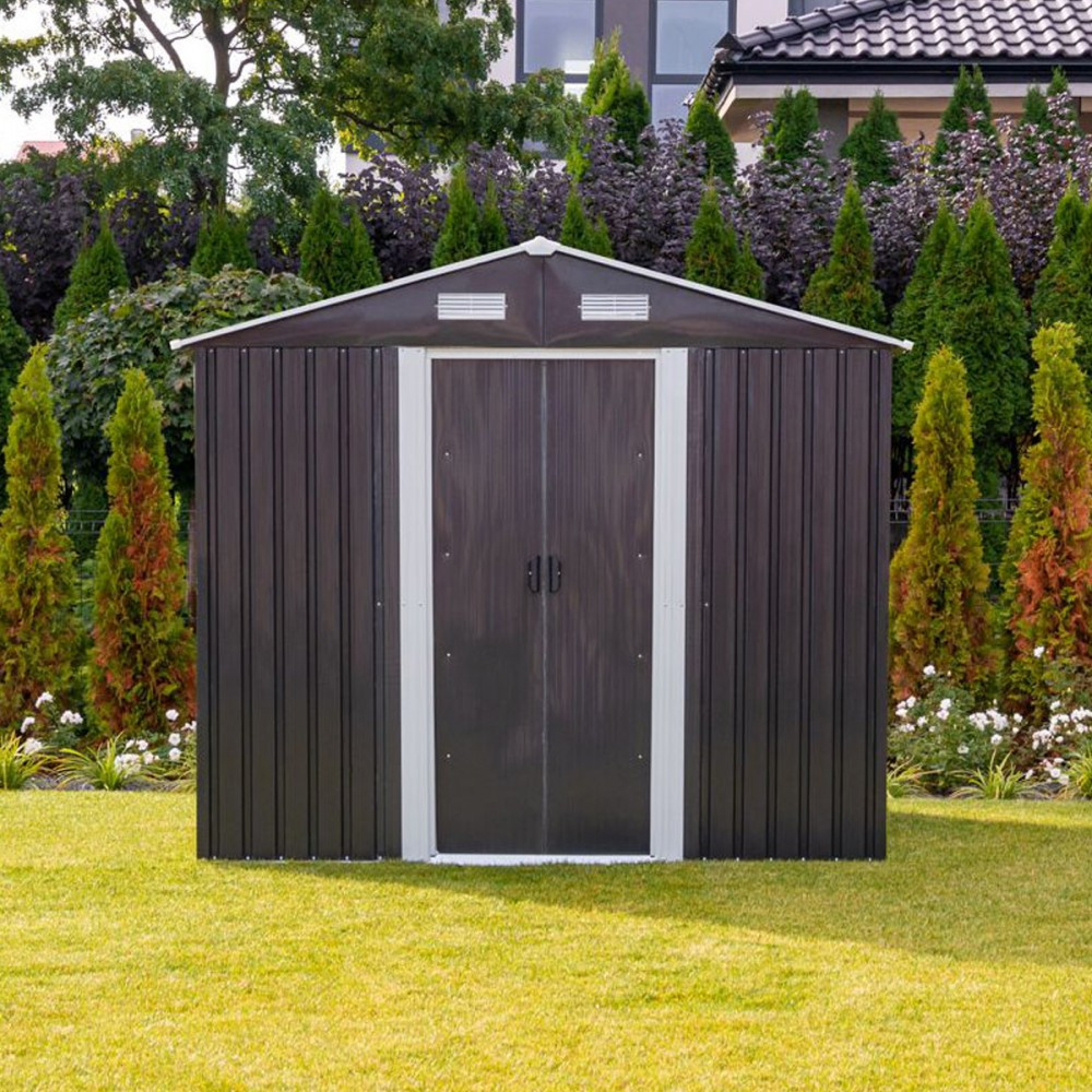 A fém szerszámház tolóajtóval rendelkezik,ennek köszönhetően nem sok helyet foglal.A kerti ház előnye az elülső fal felső részén elhelyezett szellőzőnyílások, melyek megakadályozzák a ház párásodását ezzel elkerülve a nem kívánatos penészesedést.